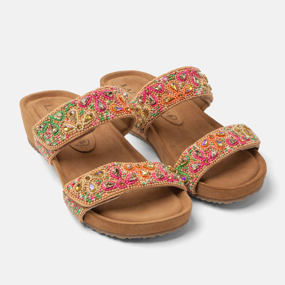 These wedge slippers from Lazamani strike a perfect balance between style and comfort. The two wide straps are richly decorated with beads and stones in a beautiful mix of colours and shapes. Both straps feature a Velcro fastening so you can adjust them for an optimal fit. The footbed is softly cushioned and lined with suede and leather for maximum comfort. The 4 cm wedge heel, also wrapped in suede, provides a gentle lift while keeping the sslippers easy to walk in. A stylish, comfortable choice for warm-weather days, without ever compromising on elegance.