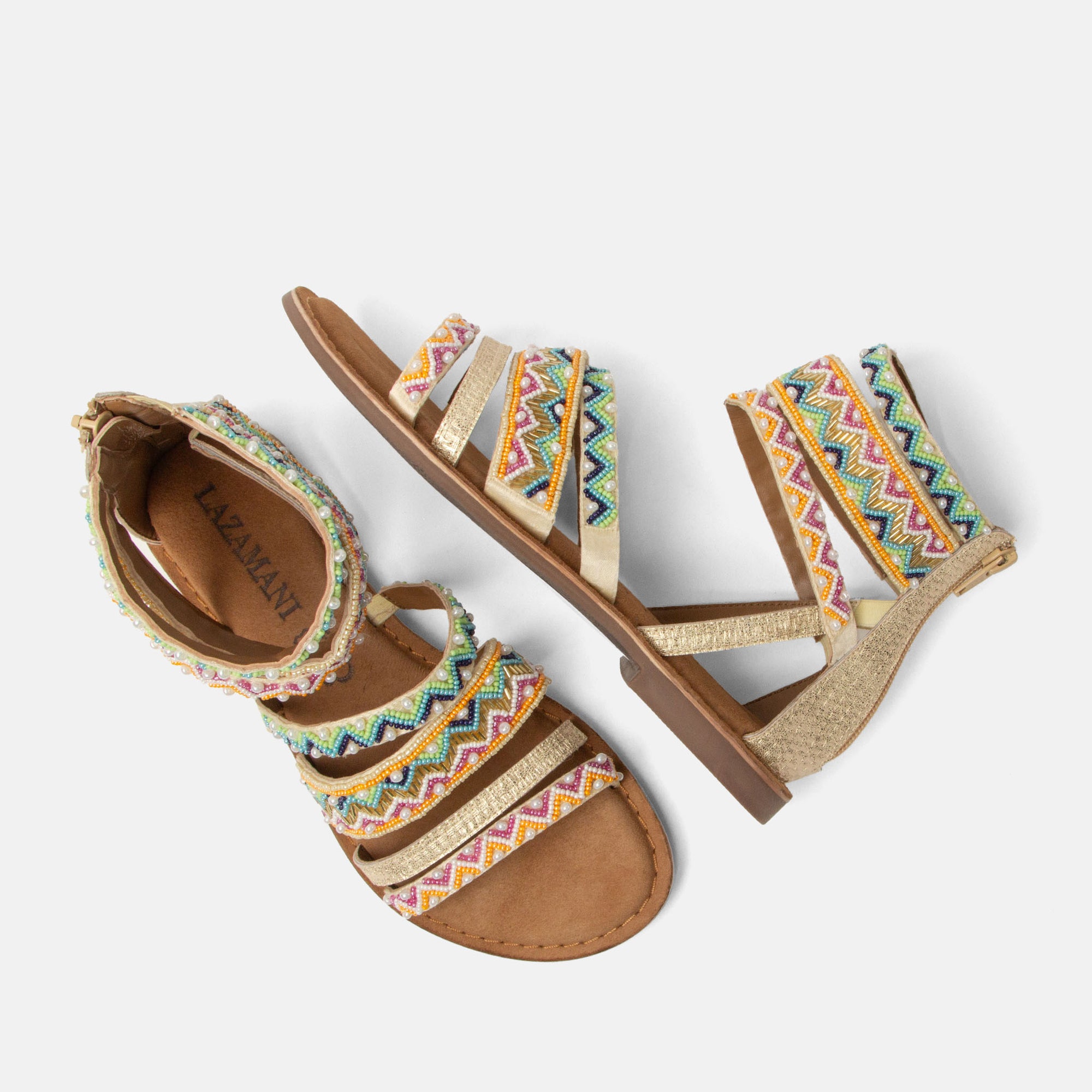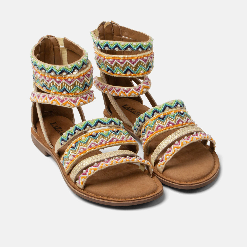 Questi sandali alla schiava contemporanei si distinguono per i loro cinturini vivacemente decorati, impreziositi da una varietà di perline con motivi giocosi. Sono inconfondibilmente Lazamani con un tocco di stile boho, garantiti per fare colpo ovunque tu vada. I cinturini sono foderati in pelle all'interno per un comfort extra. Il sottopiede Lazafeel, morbidamente imbottito, è rivestito in camoscio traspirante, assicurando che siano piacevoli anche nelle giornate calde. Una cerniera posteriore offre un facile accesso, mentre la suola in gomma offre aderenza e stabilità, rifinita con un sottile tacco di un centimetro. Dai festival soleggiati e le passeggiate in città alle serate di vacanza, questi sandali d'effetto aggiungono senza sforzo un tocco Lazamani allegro a qualsiasi outfit.