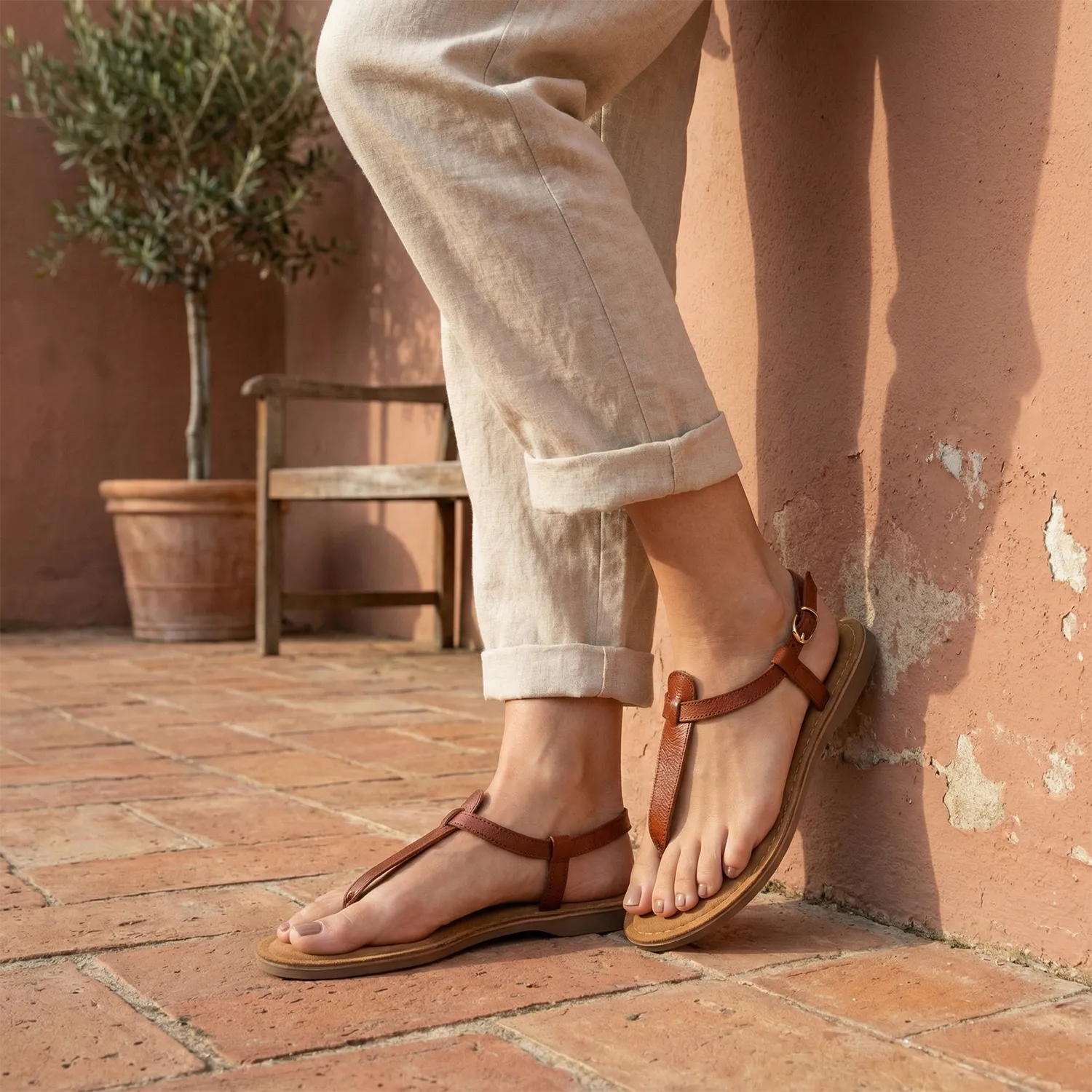 This toe post sandal is a classic which belongs in every woman's wardrobe. Timeless, stylish in any situation and comfortable to wear. The upper is made from leather in a plain colour. The buckle closure enables the slingback to be easily adjusted to your foot. The soft footbed is lined with breathable suede, making the sandal comfortable to wear on even the hottest days. A rubber sole provides grip and stability, and it has a low one-centimetre heel.