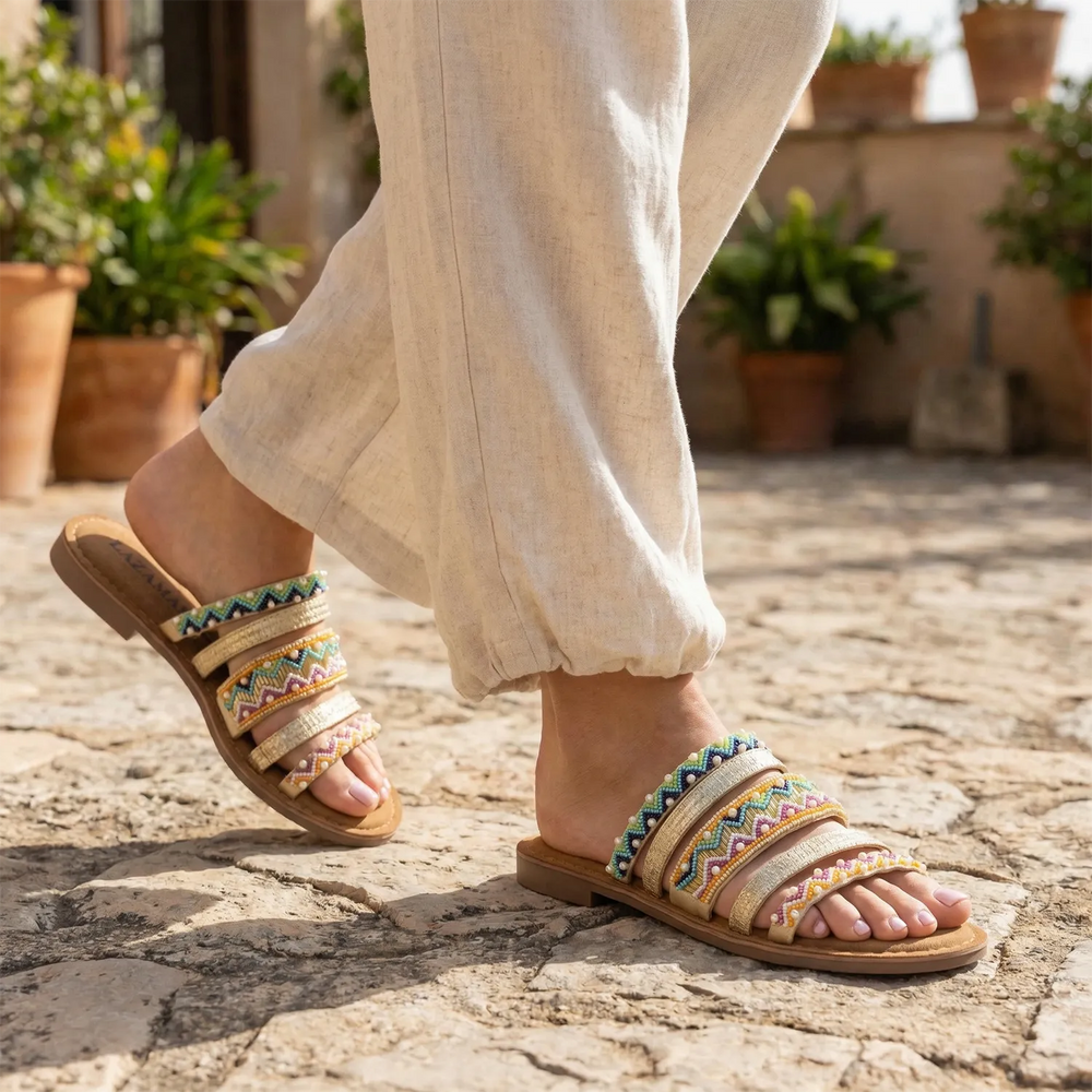 Luminoso, giocoso e disinvoltamente estivo: questo sandalo basso Lazamani è pensato per dare a ogni outfit un'immediata sferzata di energia. I cinturini foderati in pelle sono riccamente decorati con perline colorate e accenti metallici, creando un look bohémien ma raffinato. Il morbido plantare Lazafeel, rivestito in camoscio traspirante, ti assicura il comfort per tutto il giorno. Una suola flessibile in gomma offre aderenza e stabilità, rendendoli ideali per le vacanze, le giornate in spiaggia o una passeggiata in città sotto il sole. Con queste ciabatte, scegli colore, comfort e quell'inconfondibile tocco Lazamani.