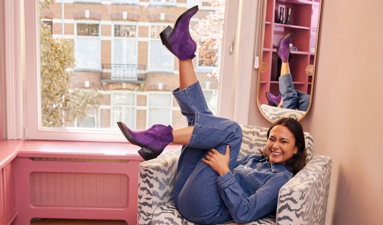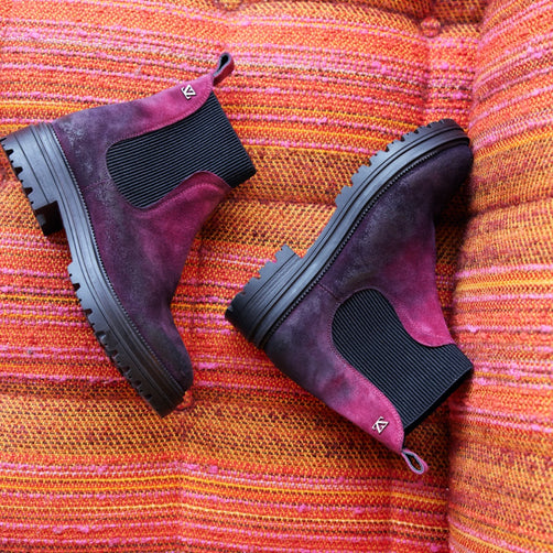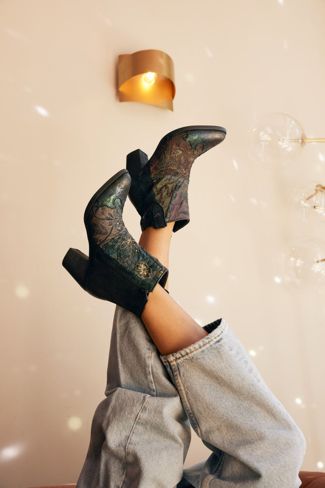 Discover our new unique collection of boots made from colourful textiles. The fabrics used are hand made from waste material by local women in Bhuj, India. This village is famous for its rich history in textile crafts and embroidery. In Bhuj, this skill is also called DANKE or AARI. For the production, the fabrics are sorted and cut into squares and sewn together. The large textile cloths are then given a special colour wash.