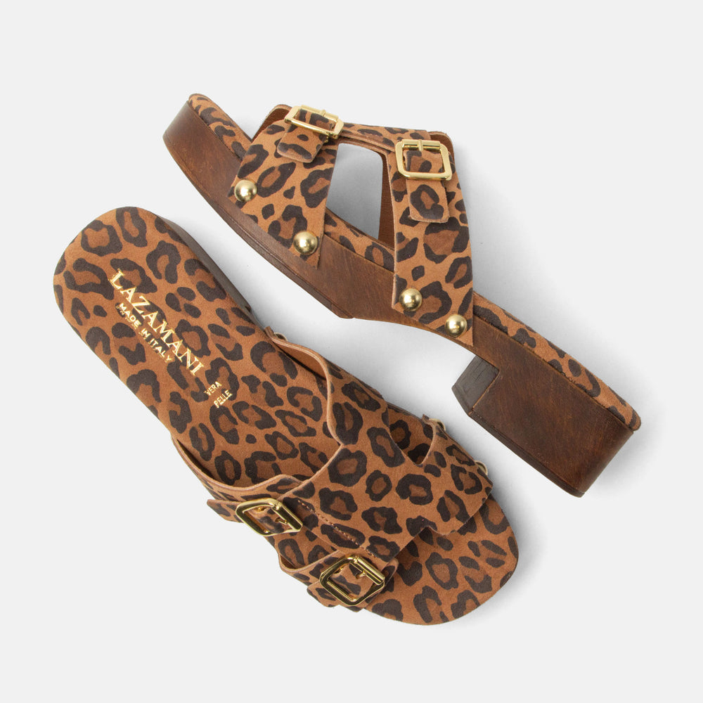 These clogs bring a bold dose of personality to your summer wardrobe, blending comfort with a touch of Italian flair. The soft suede straps with a trendy leopard print feel luxurious and are complemented by gold-tone buckles and studs. The dark wood-look block heel, measuring 3.5 centimetres, offers stability and is surprisingly comfortable thanks to the suede-covered footbed that feels soft and responsive. Wear them with a breezy dress, linen trousers or straight-leg jeans for a look that is effortlessly feminine, playful and distinctive – unmistakablyLazamani.