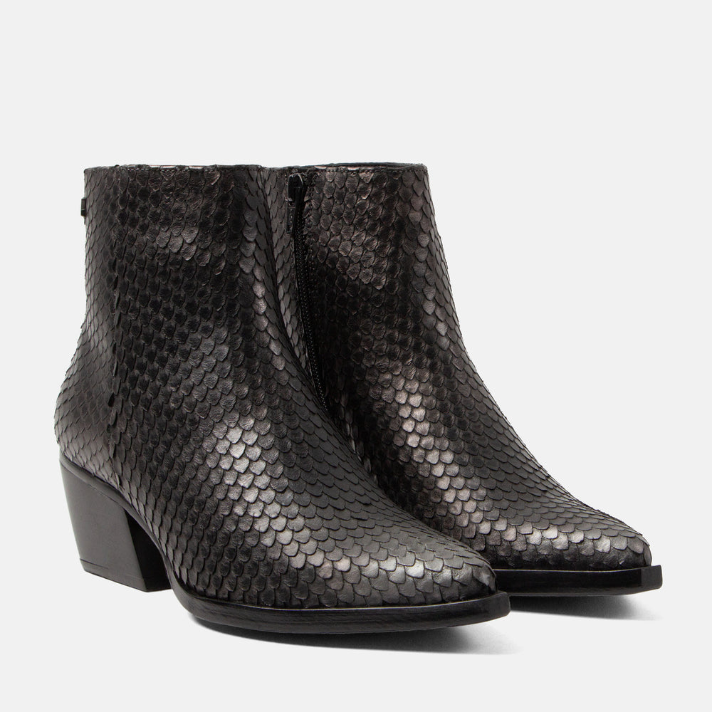 Statement-making and irresistibly stylish – these ankle boots from Lazamani command attention from the first glance. The unique leather with a 3D snake texture adds a luxurious feel and a glamorous metallic sheen. A pointed toe and block heel create an elegant yet powerful silhouette, perfect for elevating any look. A side zip allows for easy on and off, while the leather insole and soft lining provide comfort with every step. Pair them with black skinny jeans for an edgy city look or style them with a flowing midi dress for a sophisticated contrast.